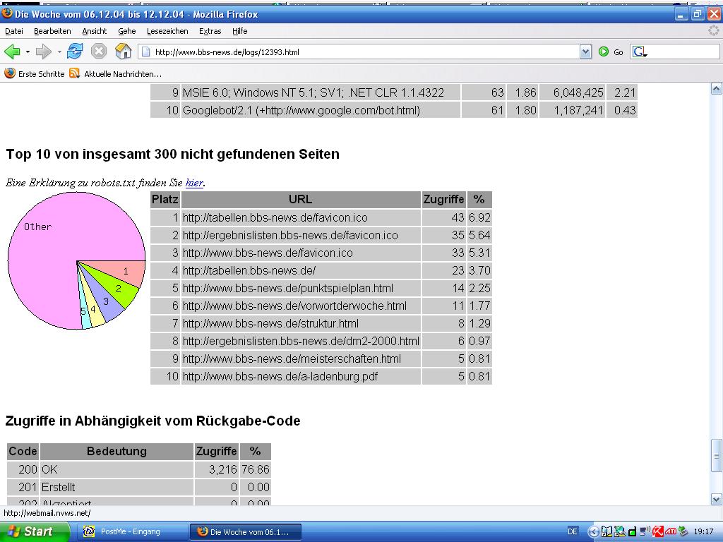 Suchmaschinen sind aber auch nicht immer aktuell. Bei der Einführung von wöchentlichen Berichten hieß die Nr. 6 so, das klang mir dann aber zu geschwollen, so dass schon seit einiger Zeit der Name diesewoche.html gilt. Es muss also gar nicht bedeuten, dass irgendwo ein falscher Link steht, sondern dass Lycos, Google und Co die alten Suchbegriffe noch nicht gelöscht haben. Auf so einen Umstand deutet die Nr. 10 hin, denn wer will jetzt im Winter wissen, was in der Ausschreibung des Ladenburger Turniers vom August 2004 gestanden hat? Selbstverständlich ist diese Seite gelöscht und wird erst wieder eingestellt, wenn die 2005er-Ausschreibung vorliegt. Derzeit ist der komplette Jahrgang 2005 aber noch nicht einmal genehmigt.